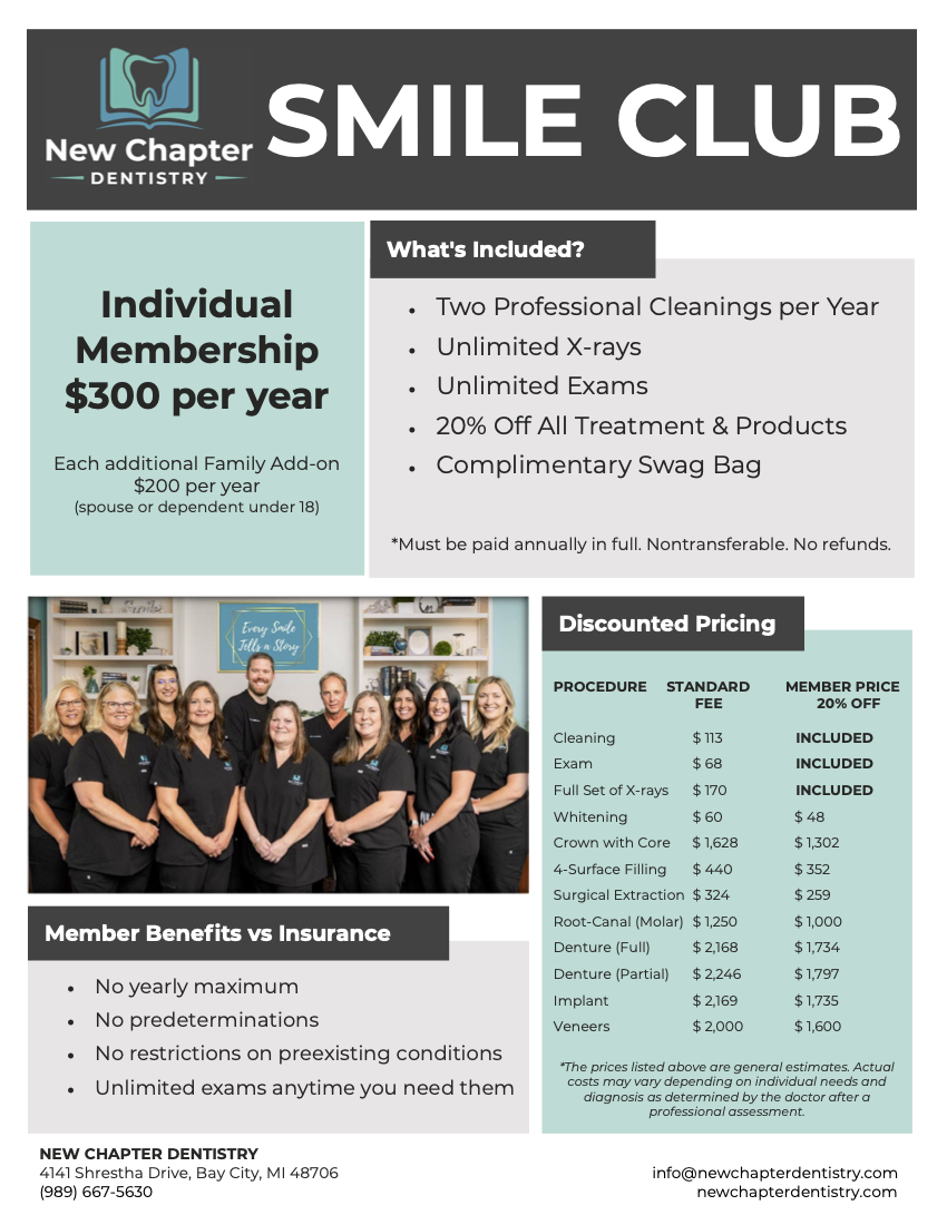 New Chapter Dentistry has an exclusive Smile Club available to those who wish to take advantage of an annual program to save on dental costs. This is a popular discount package for our patients who pay out of pocket, don’t have dental insurance, or want to try something new to save money. Get all of your dental needs covered with one comprehensive membership. We’d be honored to have you and your family join our Smile Club - let us help you tell the story you want through your smile!